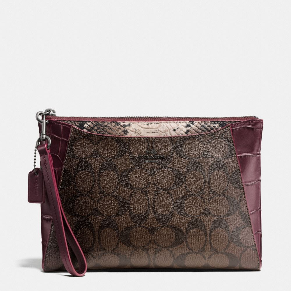 1. COACH f54628 - MORGAN CLUTCH 24 IN SIGNATURE WITH EXOTIC MIX TRIM - BLACK ANTIQUE NICKEL/OXBLOOD