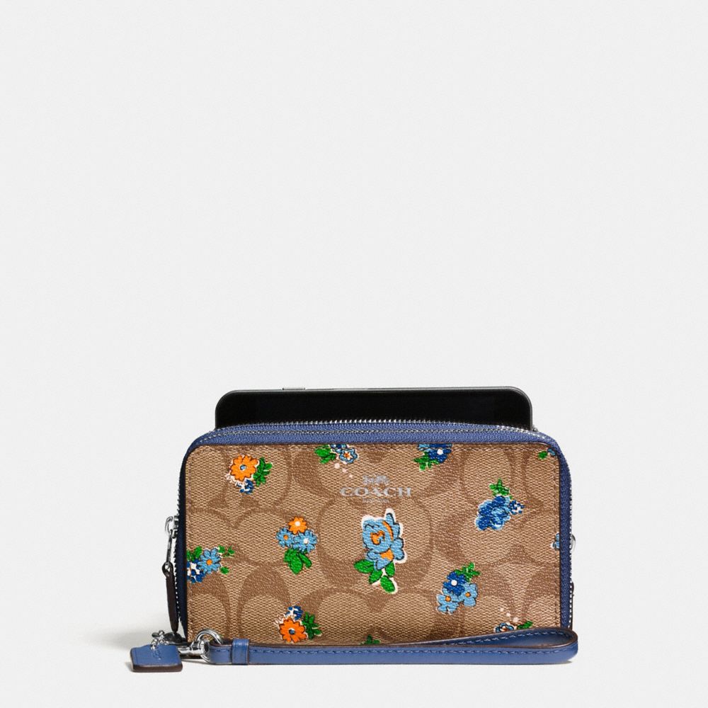 1. COACH f57959 - DOUBLE ZIP PHONE WALLET IN FLORAL LOGO PRINT - SILVER/KHAKI BLUE MULTI
