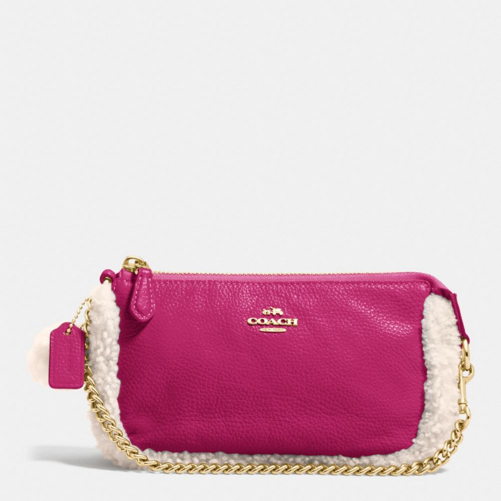 COACH F64705 - LARGE WRISTLET 19 IN LEATHER AND SHEARLING - IMITATION GOLD/CRANBERRY/NATURAL (click the link before for more detail)