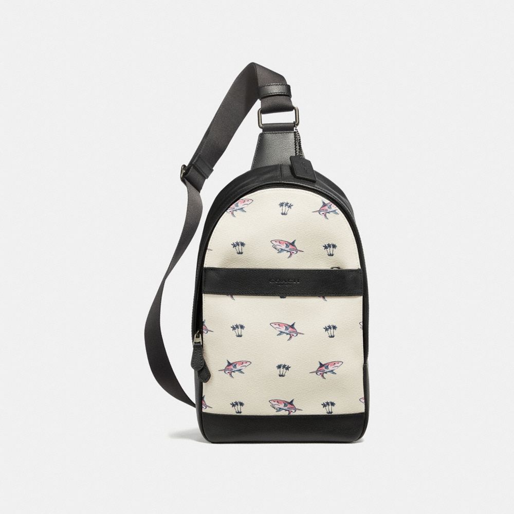 1. COACH f29030 - CHARLES PACK WITH SHARK PALM TREE PRINT - BLACK ANTIQUE NICKEL/CHALK MULTI